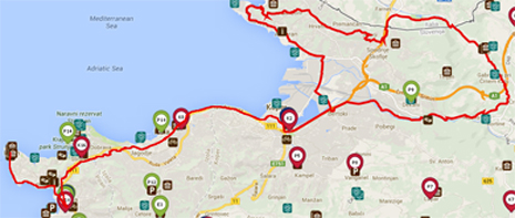 Da Pirano il sentiero ci conduce lungo la costa, oltre Bernardino, Portorose, dove svoltiamo verso l'auditorium (lì ci aspetta una salita breve), proseguiamo attraverso il tunnel della Parenzana, proseguiamo tra i campi scendendo a Strugnano, poco prima del tunel che ci porta al campeggio svoltiamo a destra lungo una strada stretta. Alla fine della strada dobbiamo svoltare a sinistra e prima del ponte di nuovo a destra (ci ritroviamo di nuovo tra i campi), da lì basta seguire l'unica strada e alla fine svoltare a sinistra. La strada è stretta e tortuosa, e durante l'estate è piena di ciclisti, escursionisti e trattori, quindi cautela è attenti e preparati a tutto. Seguite tutta la strada fino alla fine, dove si gira a destra in direzione Dobrava. Davanti a noi ce una breve salita, una volta su, girate a destra e proseguite fino al tunnel Jagodje. Dall'altra parte del tunnel proseguite lungo il sentiero fino alla fine (contrassegnata con il segno della bicicletta) dove arriverete ad un incrocio dove si gira a sinistra verso Isola e sulla strada principale a destra verso il negozio di bici, che è a un bivio. Da qui proseguite fino al mare. Lungo la costa si va fino alla stazione ferroviaria di Capodistria e proseguite in direzione Ancarano, Barižoni, Crevatini, Škofije, parte del percorso e sul teritorio Italiano, Osp, Črni Kal, Rižana, Capodistria e indietro fino a Pirano.